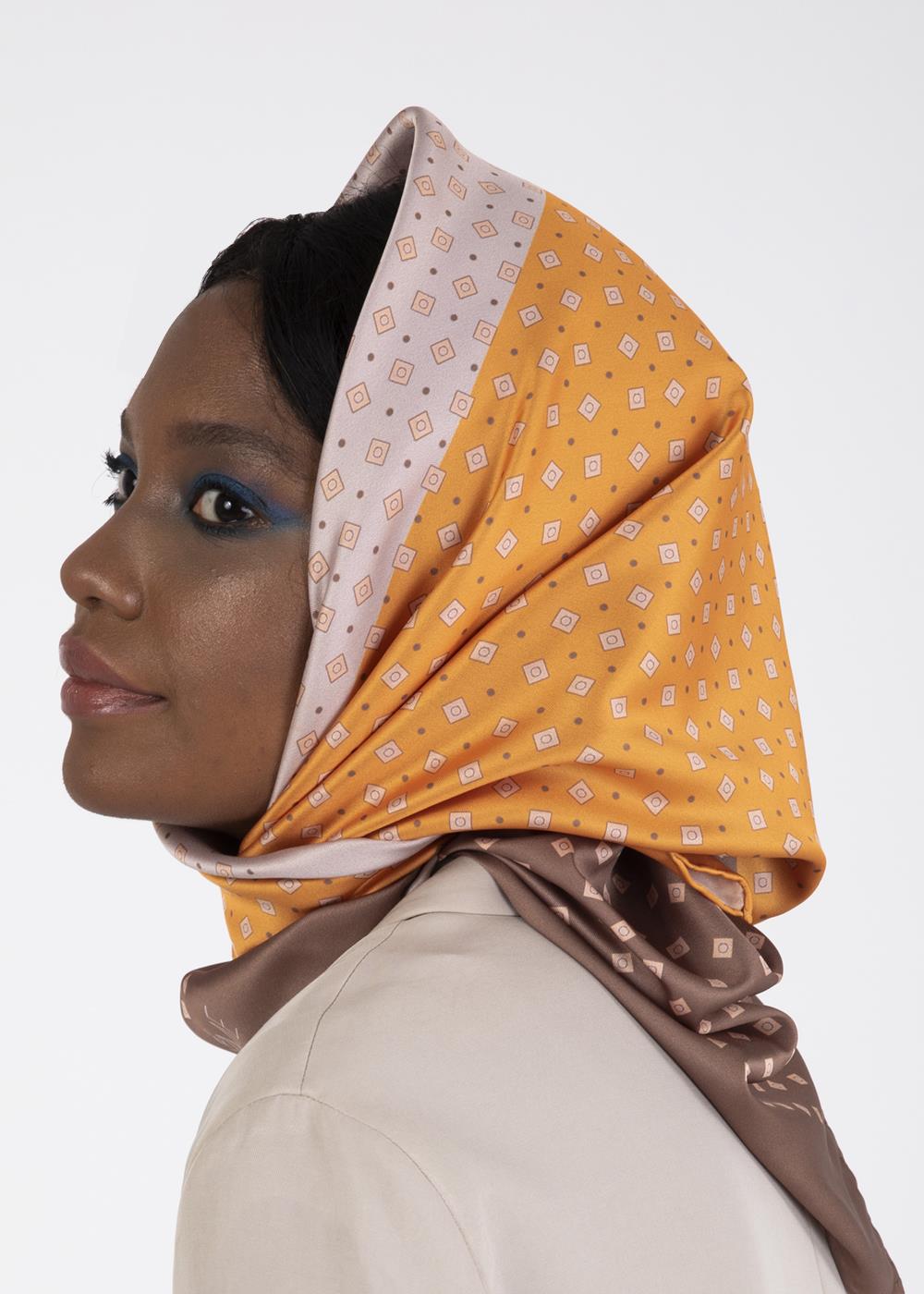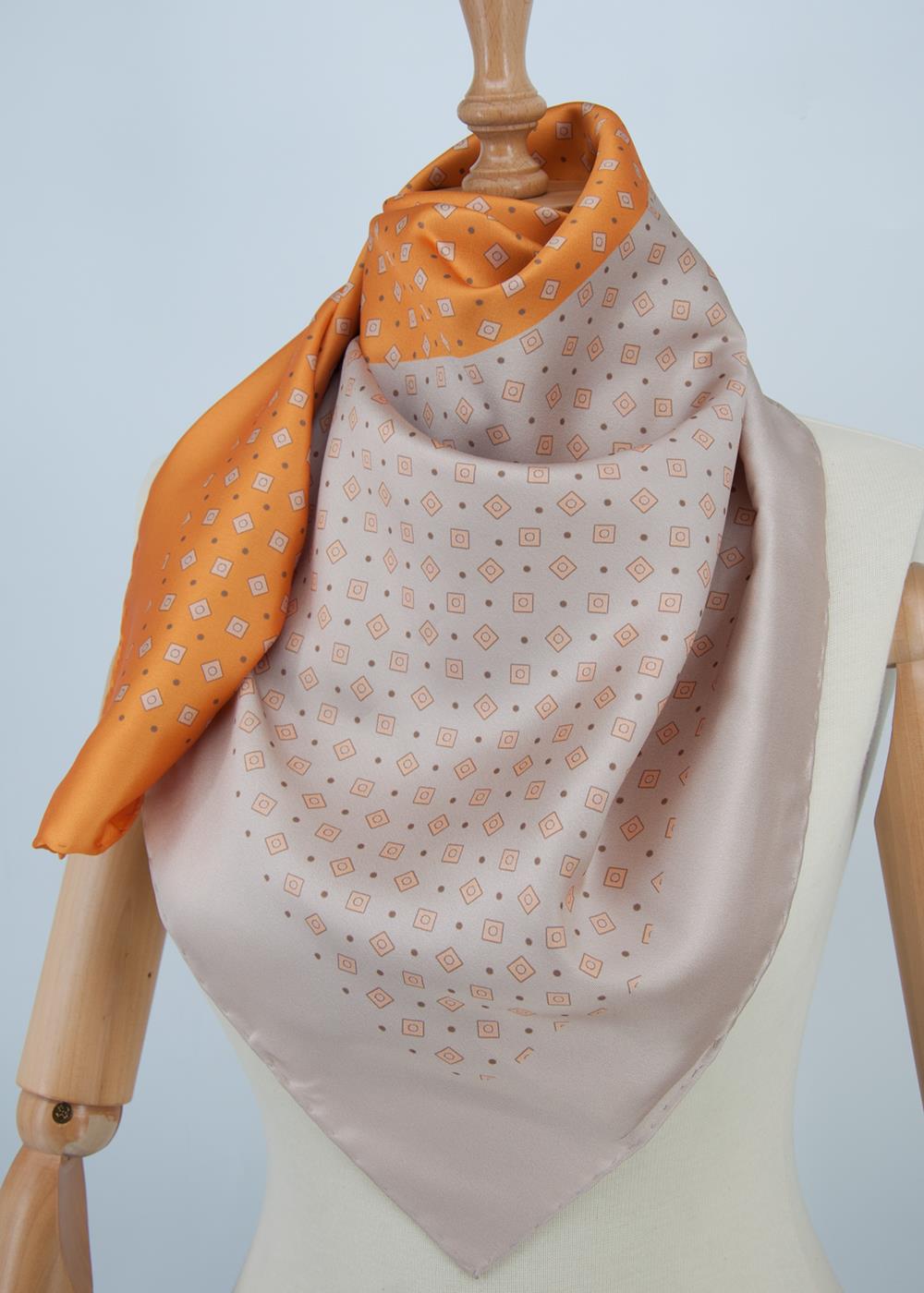 95 x 95 cm   Polyester Twill kumaştan eşarp. Çift taraflı baskı ile üretilmiştir. El dikişi...