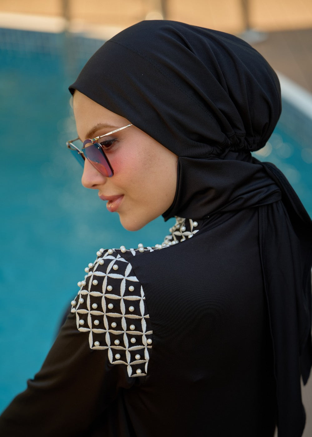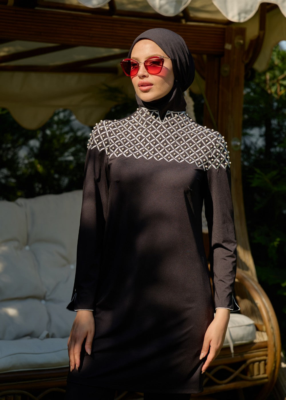Nakış ve inci işlemeli, asil, fark yaratan, denizde ve plajda şıklık sağlayan tasarım mayomuz;