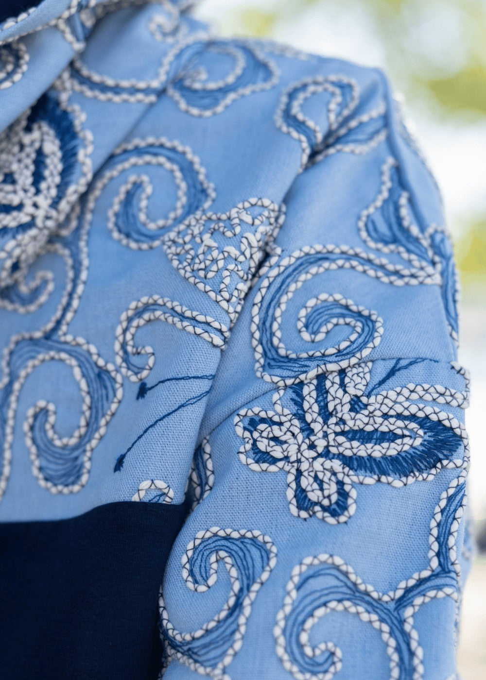 Keten kumaş üzerine, kordon nakış detaylı, tesettür eşofman üstü, ücretsiz kargo ile; Omuz, kollar ve...